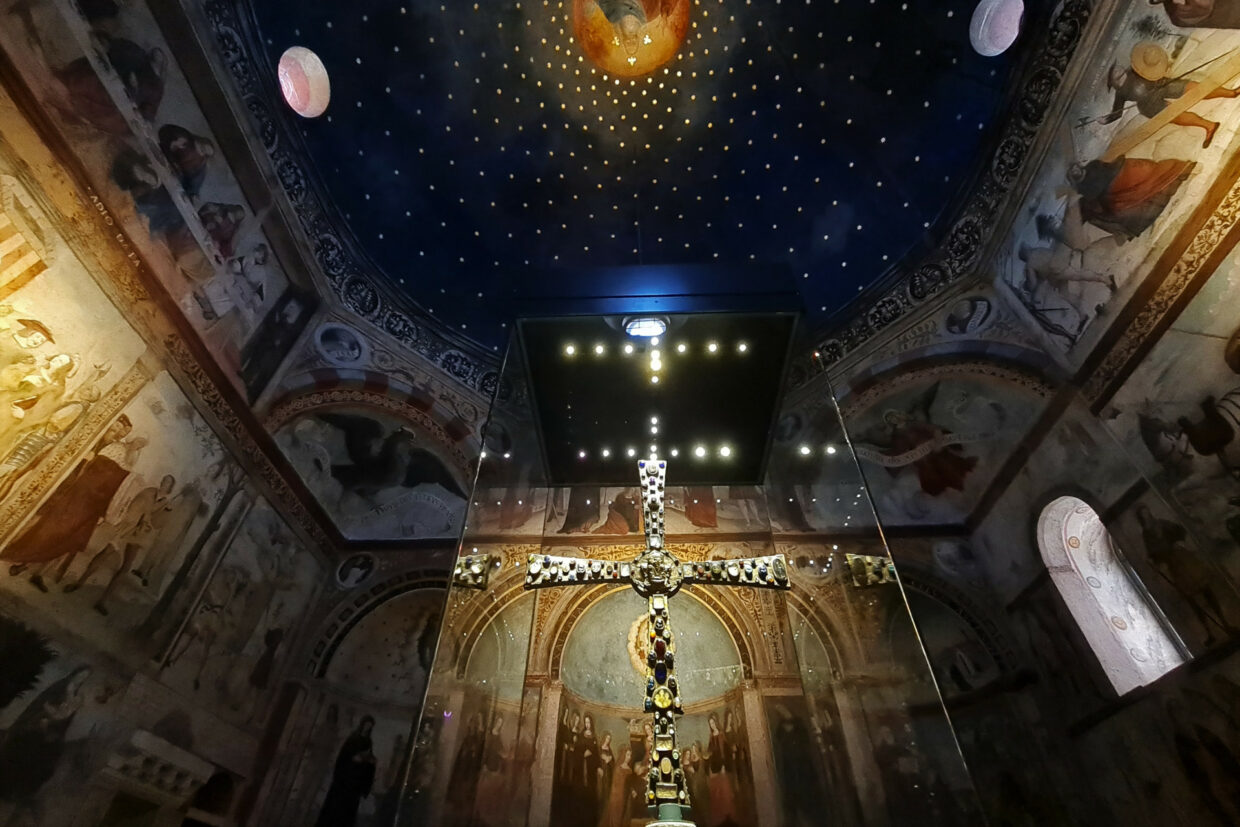 In Santa Maria in Solario, romanico oratorio delle monache, è esposta la cosiddetta “Croce di re Desiderio”, splendida croce processionale di età carolingia impreziosita da 212 gemme il cui splendore è amplificato dall’oro delle stelle su cielo blu lapislazzulo della cupola.
