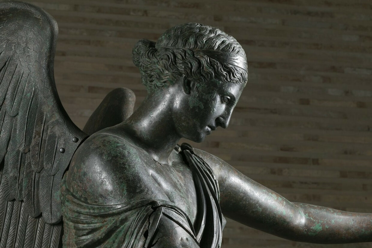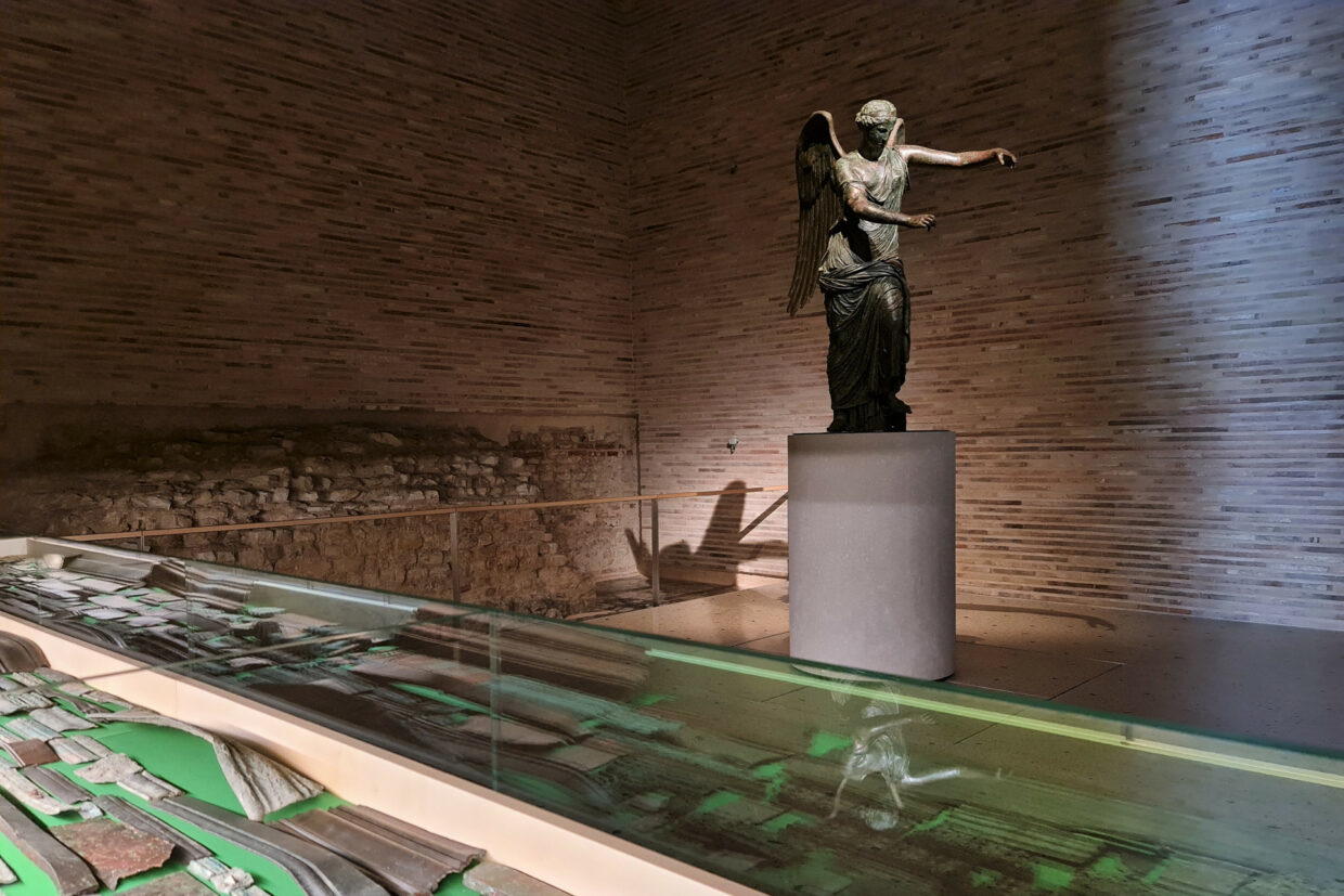 La Vittoria alata si può ammirare oggi in una delle tre celle del Capitolium. La famosissima statua in bronzo, alta quasi due metri, venne ritrovata nel 1826 insieme ad una quantità enorme di altri bronzi romani. L’ambiente sul retro del tempio in cui si trovavano riposti, era stato appositamente occultato in età tardo romana probabilmente per proteggerli da prevedibile distruzione.